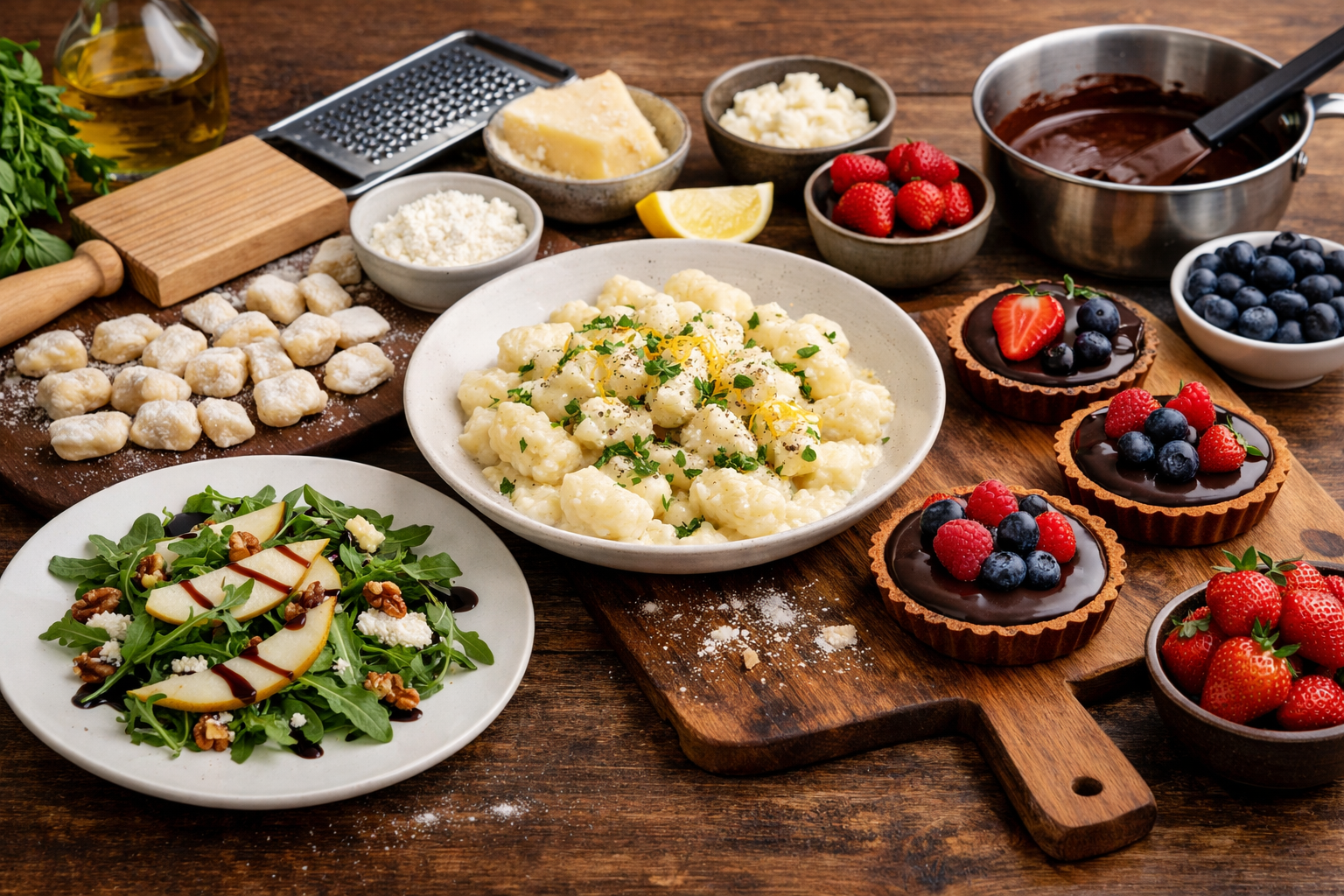 Join a hands-on cooking class featuring handmade gnocchi with lemon ricotta cream, arugula pear salad, and chocolate ganache tarts. ...